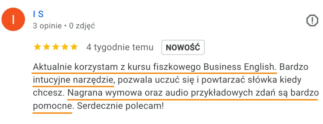 Poznawaj całe wyrażenia i zwroty Business English od razu w kontekście, z poprawną wymową (wyrażenia i całego zdania!) i obrazkiem w formie fiszek online, co sprawia, że jeszcze lepiej i szybciej zapamiętujesz! Taka nauka jest skuteczna i po prostu wciąga!
