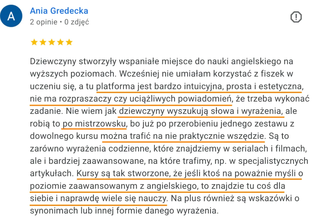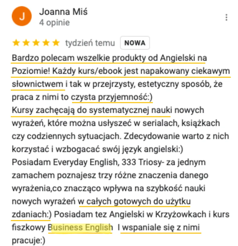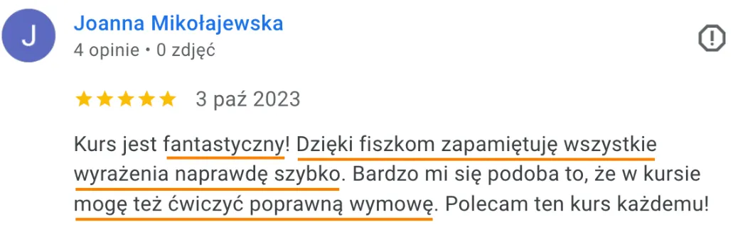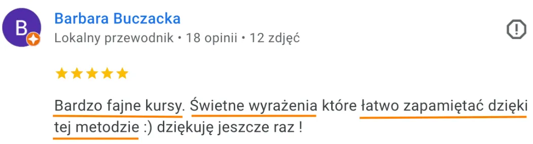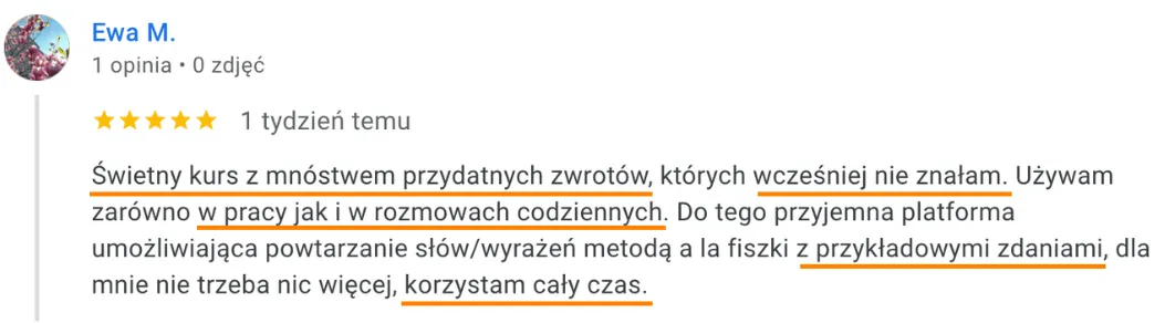 - Poznasz praktyczne słownictwo do wykorzystania od zaraz, przećwiczysz te sytuacje ‘na sucho’ w materiałach bonusowych i przestaniesz się w końcu stresować!