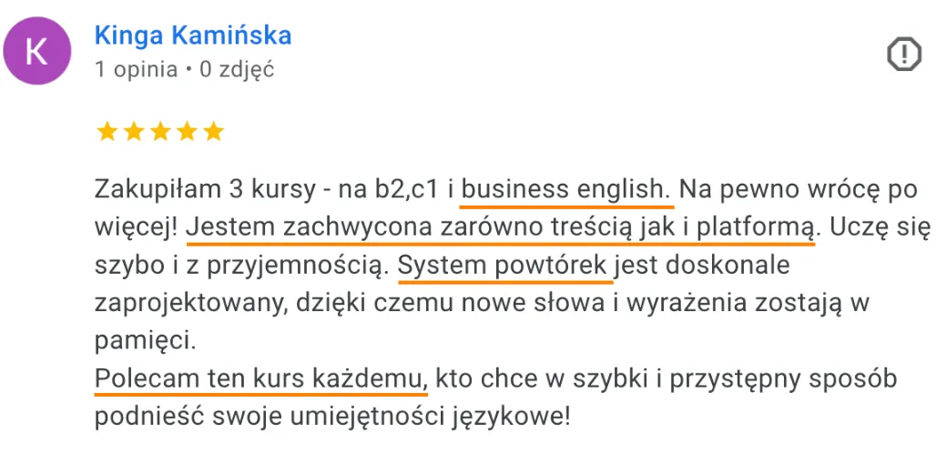 a) Jesteś już naszym klientem/klientką i uczysz się z innymi naszymi kursami? Twoje dane do logowania się nie zmieniły. Logujesz się tak jak poprzednio na www.kursy.korepetycjapatrycja.pl, a kurs ‘Business English’ już czeka na Ciebie w zakładce ‘Moje kursy’. Odbierz go czym prędzej!;)