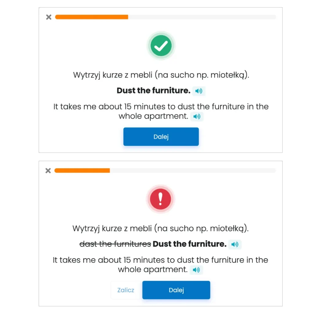 Metoda tłumaczeniowa uczy Cię nie tylko nowych zwrotów, ale też jak je poprawnie łączyć w całe zdania – więc od razu ćwiczysz gramatykę i mówienie.