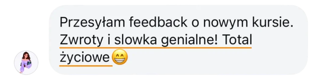 Ten kurs to nie teoria. To konkretne, życiowe zdania, których naprawdę używasz na co dzień. Do tego smart powtórki, krótkie lekcje i praktyczny system, dzięki którym uczysz się skutecznie, nawet jeśli masz tylko 10 minut dziennie.