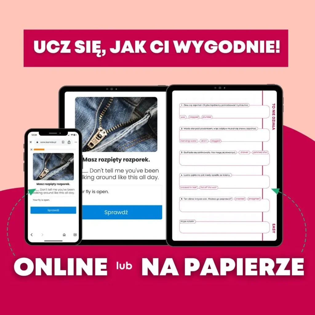 W dwóch poziomach (easy + hard), żebyś mogła zacząć od prostych zdań i bez stresu wskoczyć na wyższy poziom.